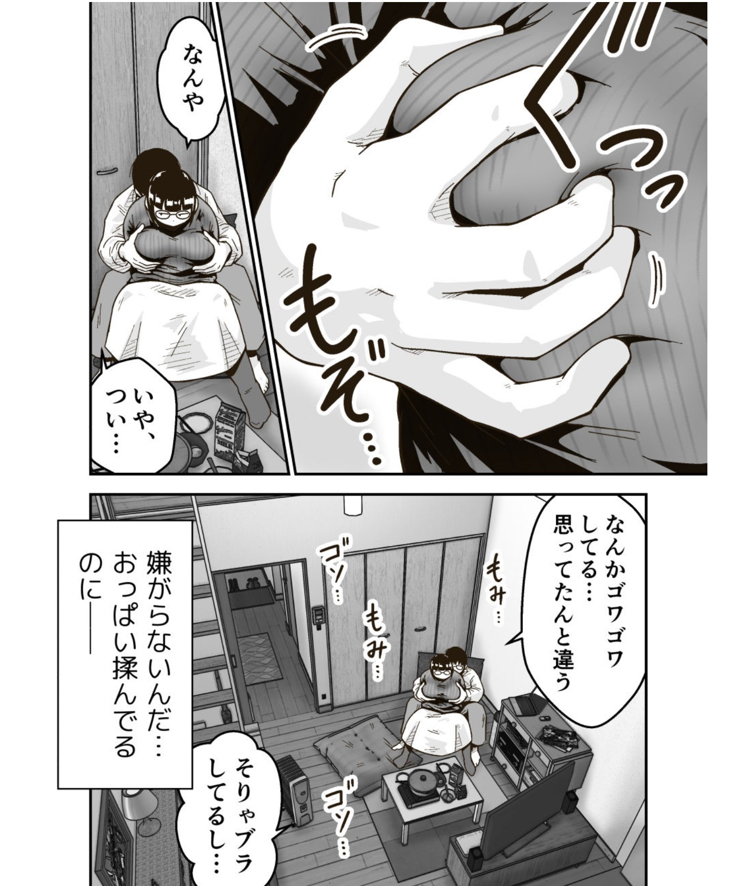 ヒロインの斎藤さんは、設定タグにある通り長髪、巨乳/爆乳、眼鏡、セーター、ぽっちゃりといった属性を持っており、おさわりやストッキングといった日常に溶け込むフェチズムが楽しめます。特にロフトベッドという密室のシチュエーションと、カメラワークに工夫が見られる俯瞰の構図が、読者を作品の世界に引き込みます。